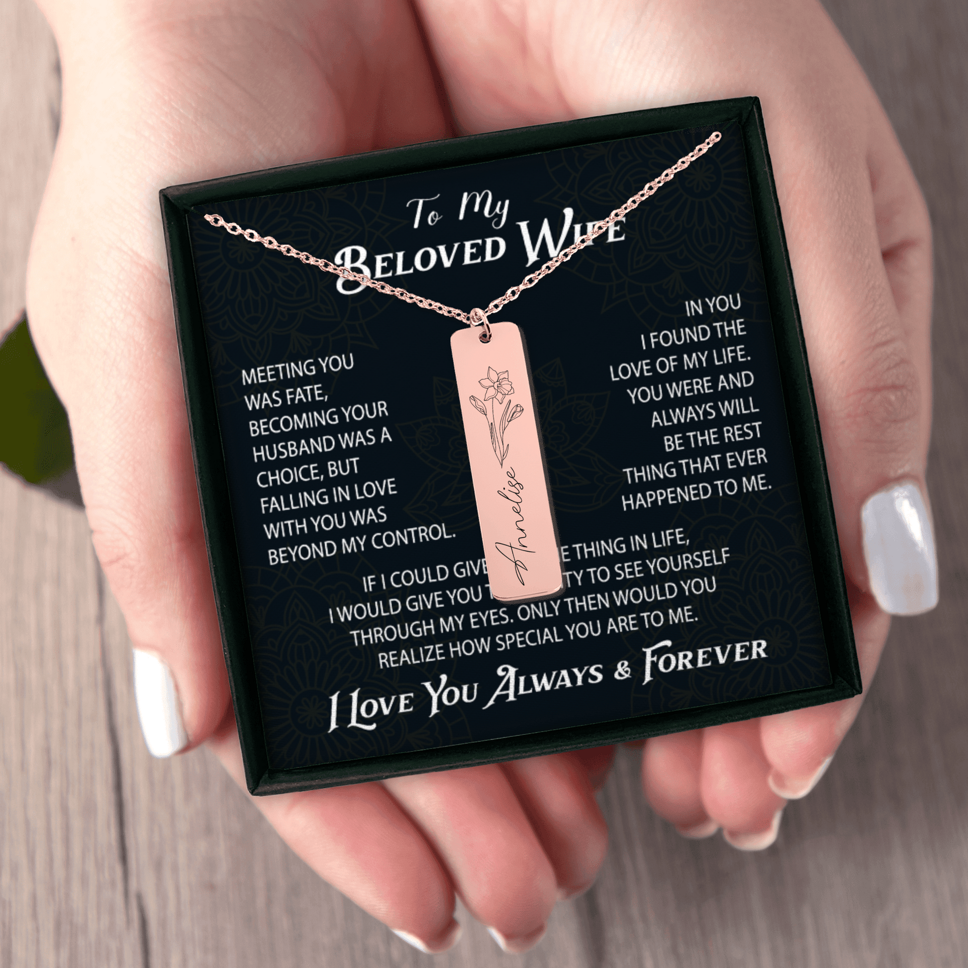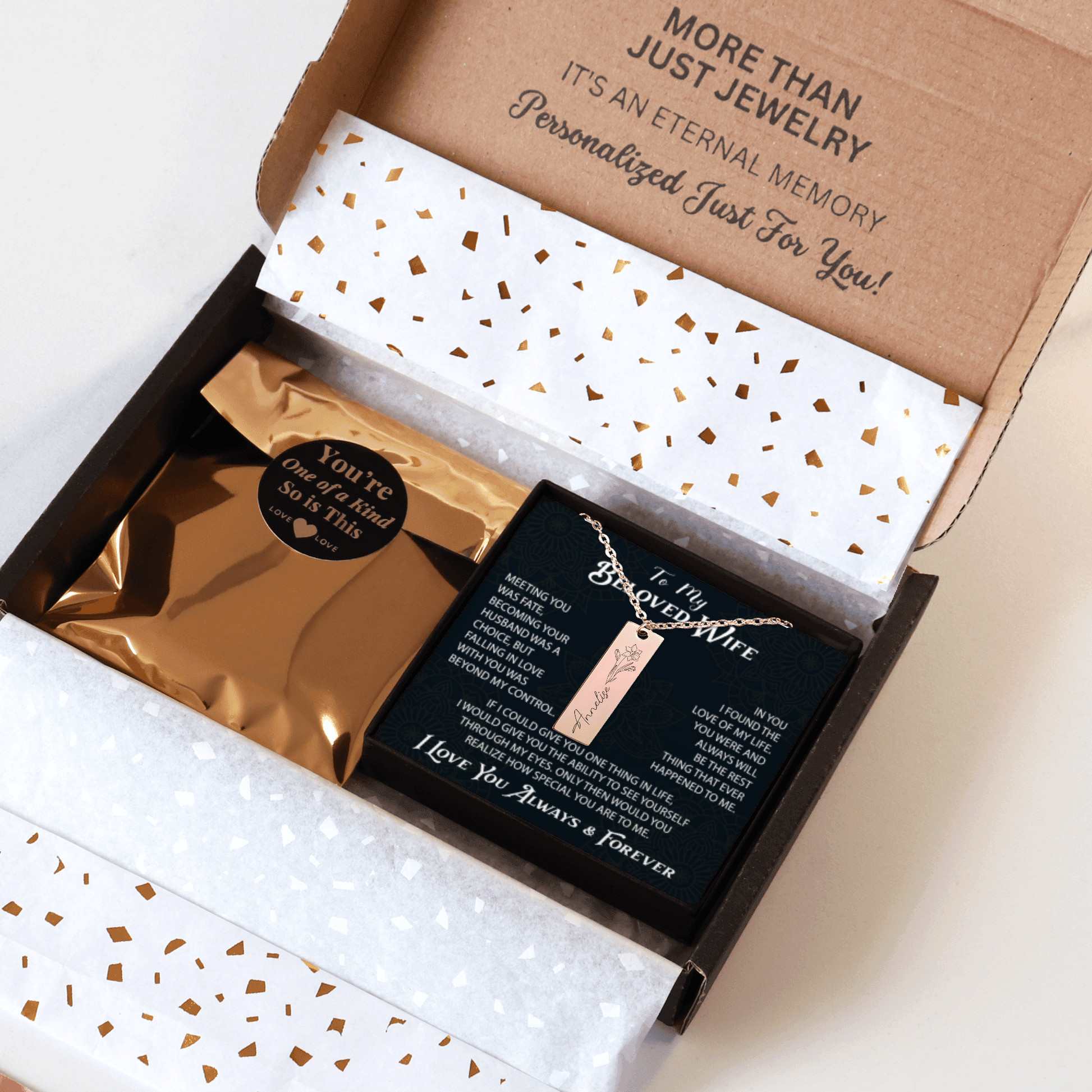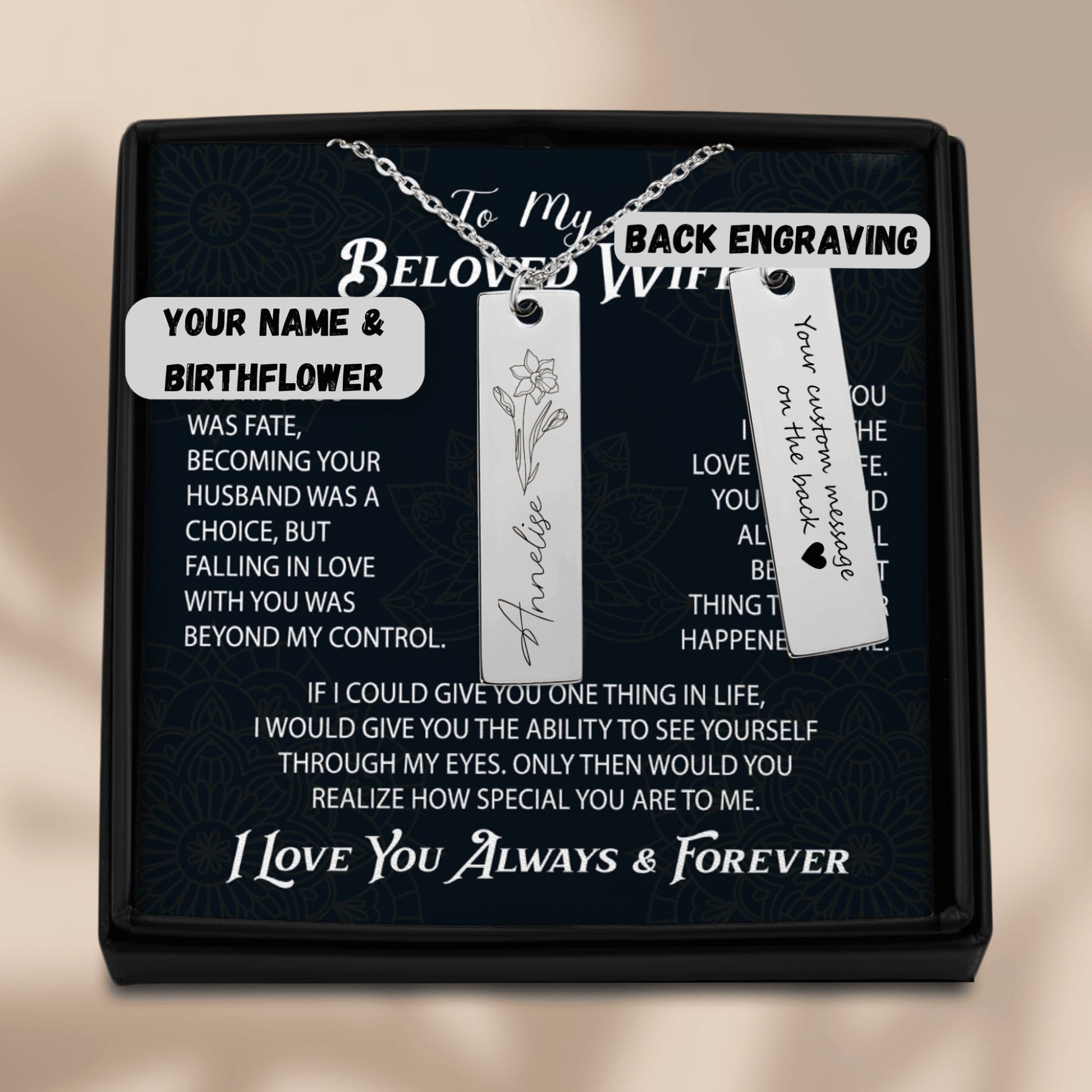 A beautifully engraved necklace, which you helped create!. The necklace will be packed in a gift box.
