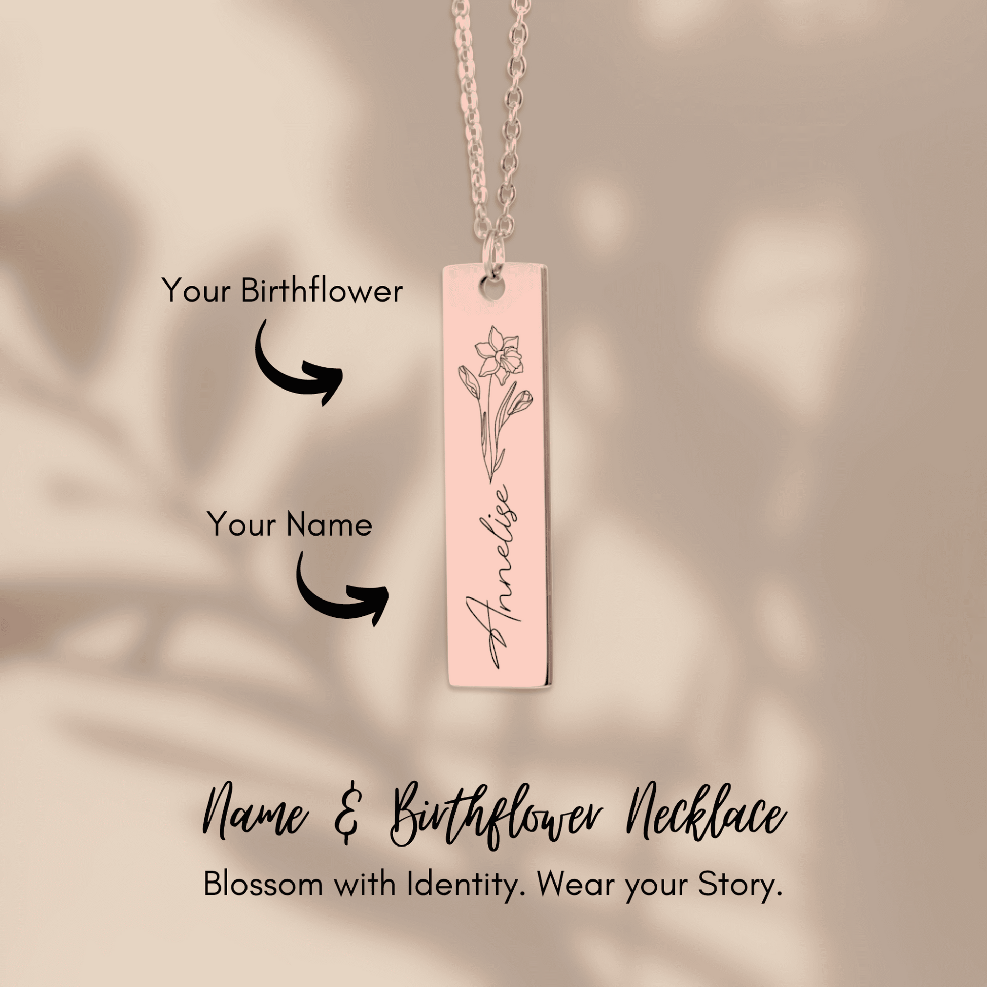 Create a truly unique gift by personalizing this necklace with a name and a birth flower. Optionally, you can choose to give the necklace an even more personal touch by adding a custom message or coordinates on the back.