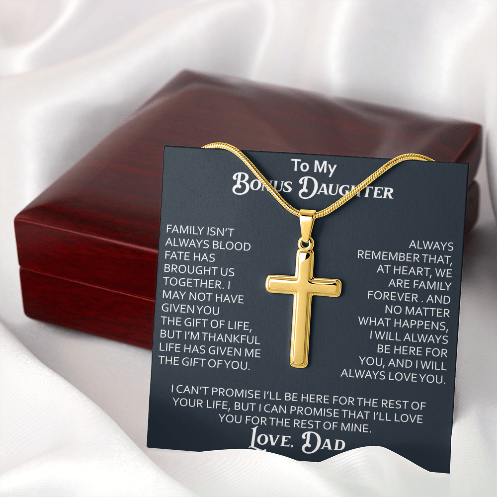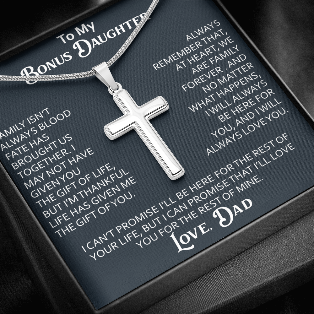 To My Bonus Daughter Artisan Cross Necklace Meaningful Gift from Dad, Stepdaughter Heart Family Love Jewelry
