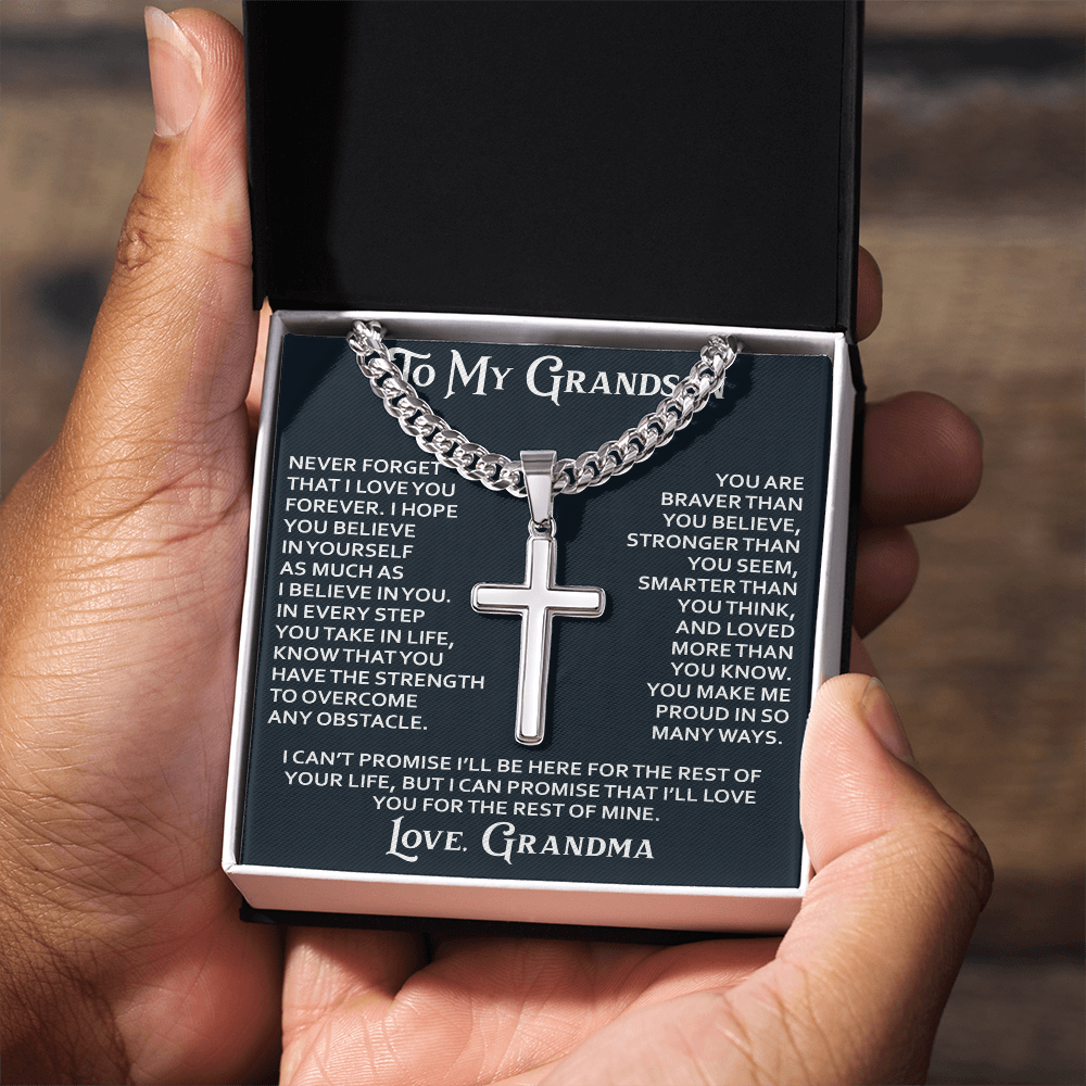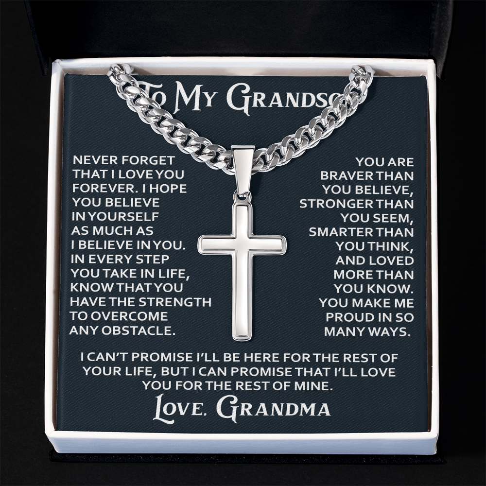 To My Grandson Personalized Cross with Cuban Link Chain From Grandma Grandmother for Christmas, Noel, Birthday, Back to School or Family Matching