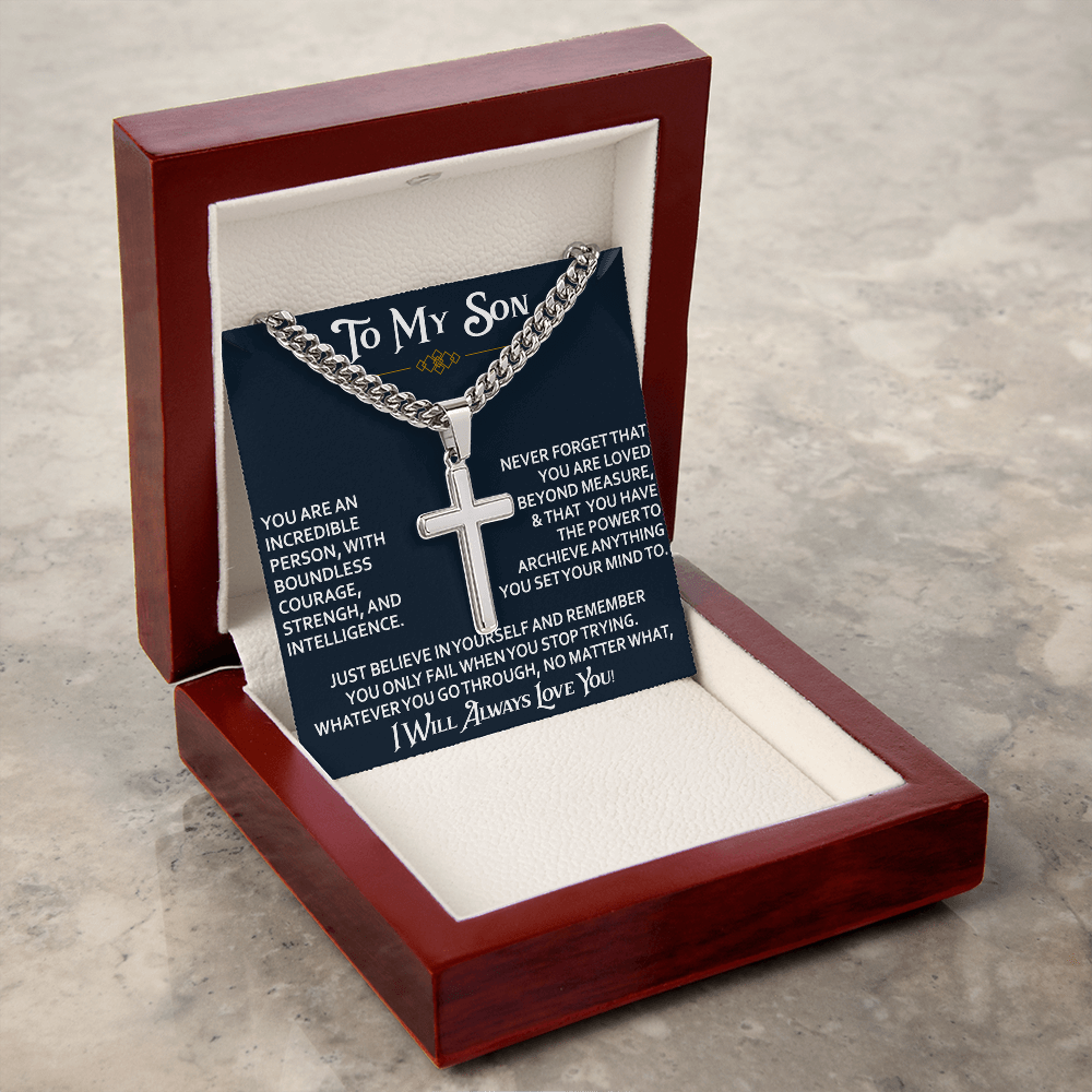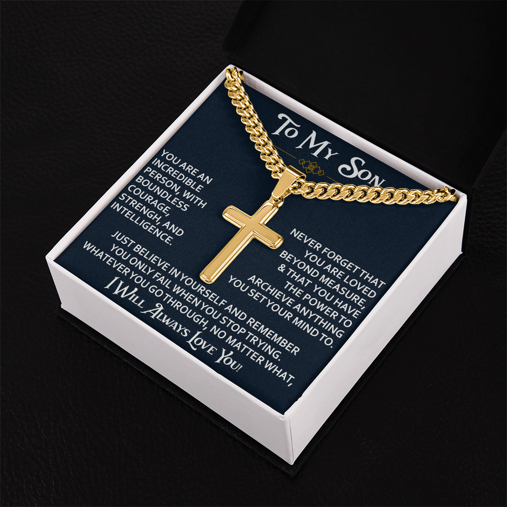 To My Son Personalized Cross with Cuban Link Chain Gift from Dad Mom - Unique Gift for Birthday, Back to School, Graduation or any Special Occasion.